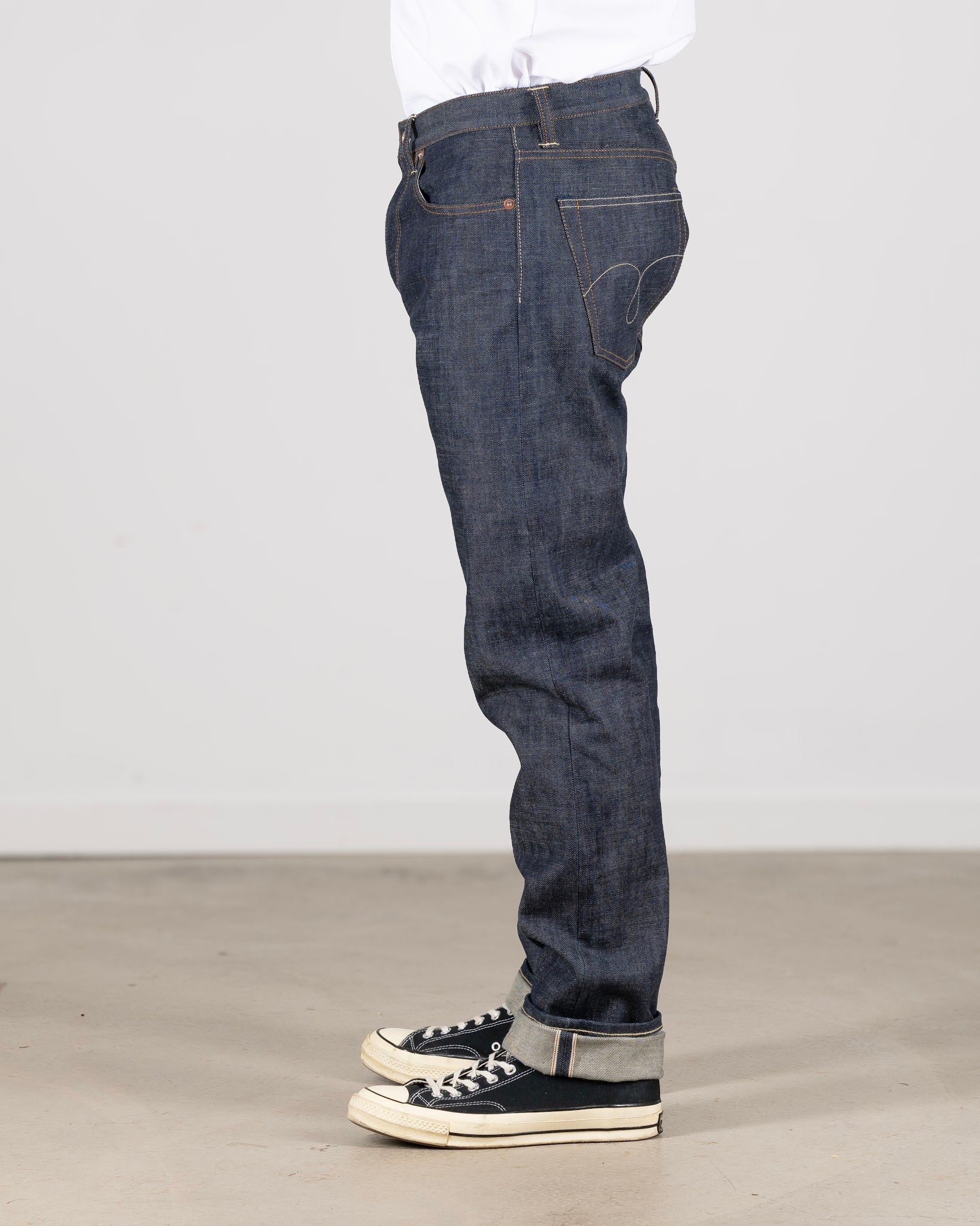 The denim is woven by Candiani in Italy on old shuttle looms from the 1960s. You’ll spot the redline selvedge edge when you roll the cuff—and on the fly, and the coin pocket.
